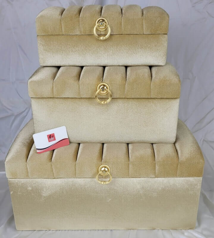 Un set de 3 boîtes trousseau de mariage en velours, avec différentes tailles, permet d’organiser, valoriser et hiérarchiser les éléments du trousseau tout en créant une scénographie harmonieuse.